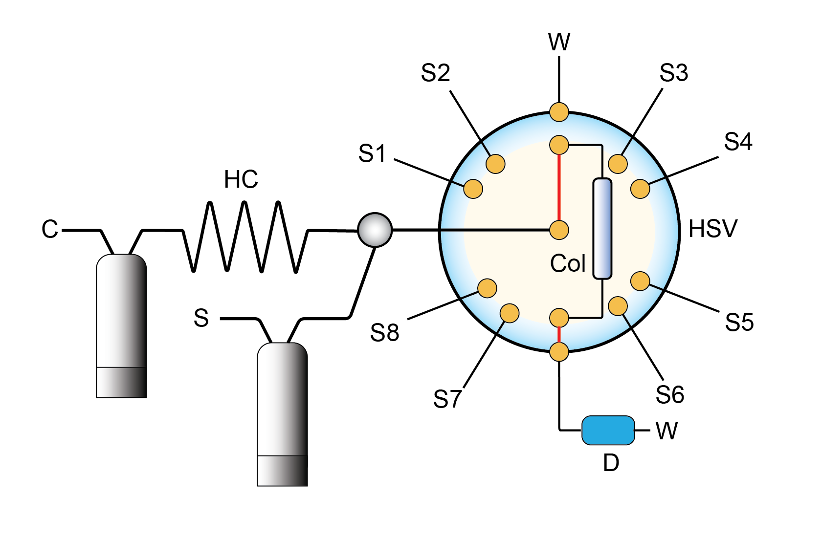 Fig. 1. A pFI/SIA system designed to enable large-volume sample loading. C: carrier, S: sample/standard, HC: holding coil, HSV: hybrid selection valve, Col: column, D: detector, W: waste.