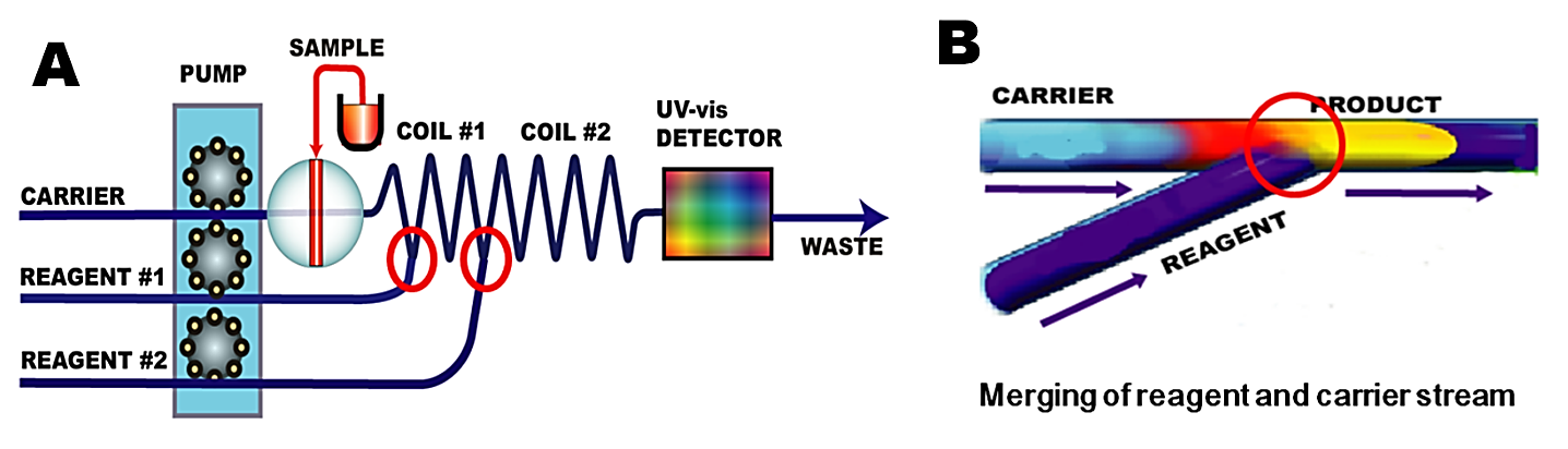The key feature of multiline FI manifolds (A) systems is the confluence point (B), where two streams merge at a T formed junction. Stream merging promotes an instant radial mixing resulting in an even concentration of reagent along the entire length of the injected sample zone.