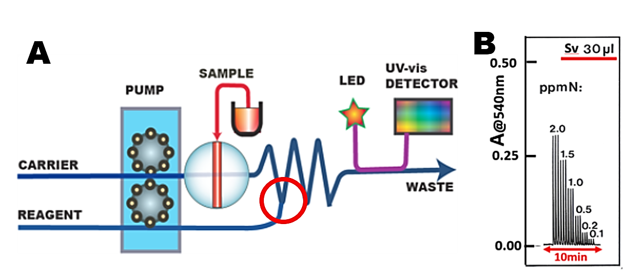 Two stream single reagent manifold (A), was used for spectrophotometric assay of nitrite based on Griess reaction, whereby nitrite is converted into red azo dye monitored at 540 nm. The reagent, prepared in diluted phosphoric acid is merged with sample, injected into carrier stream of distilled water at a confluence point, where streams, each pumped at a rate of 1.5 mL/min, combined. The reaction coil, 40 cm long and 0.8 mm I.D. was kept at a room temperature. Since the flowrate through reactor (volume 200 µL) was 50 µL/sec, the incubation time was only four seconds, yet sufficiently long, to produce concentration of the dye that allowed assay to be carried out in a range of 2 to 0.002 ppM of Nitrogen (as nitrite) (B).
