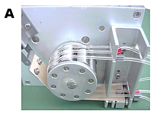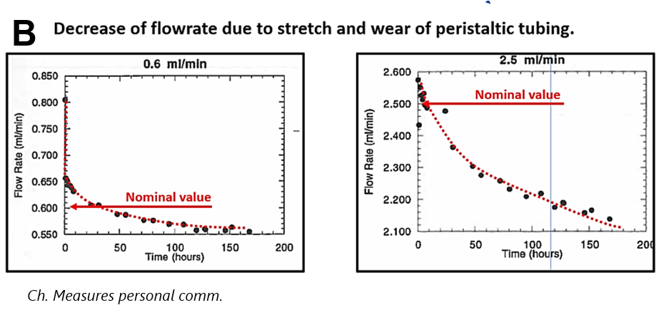 for FI systems, because they generate continuous flow in several parallel channels, where flow rates can be easily adjusted by rotation rate of a drum and by I.D. of the peristaltic tubing. Contributing to the popularity of peristaltic pumps is their apparent low cost, although the price of consumables – the peristaltic tubing- exceeds many times the purchase price of the pump over its lifetime. The largest drawback of peristaltic pumping is the elasticity of the tubing, causing flow rate to decrease during use (B). Therefore, the instrument has to be frequently calibrated and peristaltic tubing has to be replaced.
