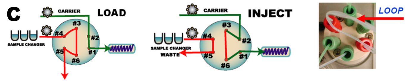 A two position, six port injection valve (C) with a fixed loop is the most frequently used for injection of well-defined sample volumes. The volume of the external is selected between 20 and 100 µL by changing the length and I.D. of the tubing. The valve can be switched from load to inject mode manually or automatically, and the loop can be filled either manually by syringe, or automatically from an autosampler by means of a pump. It is important to keep the length of the conduit between sample container and port #4 as short as possible, to save sample material, and to avoid sample-to-sample cross contamination.