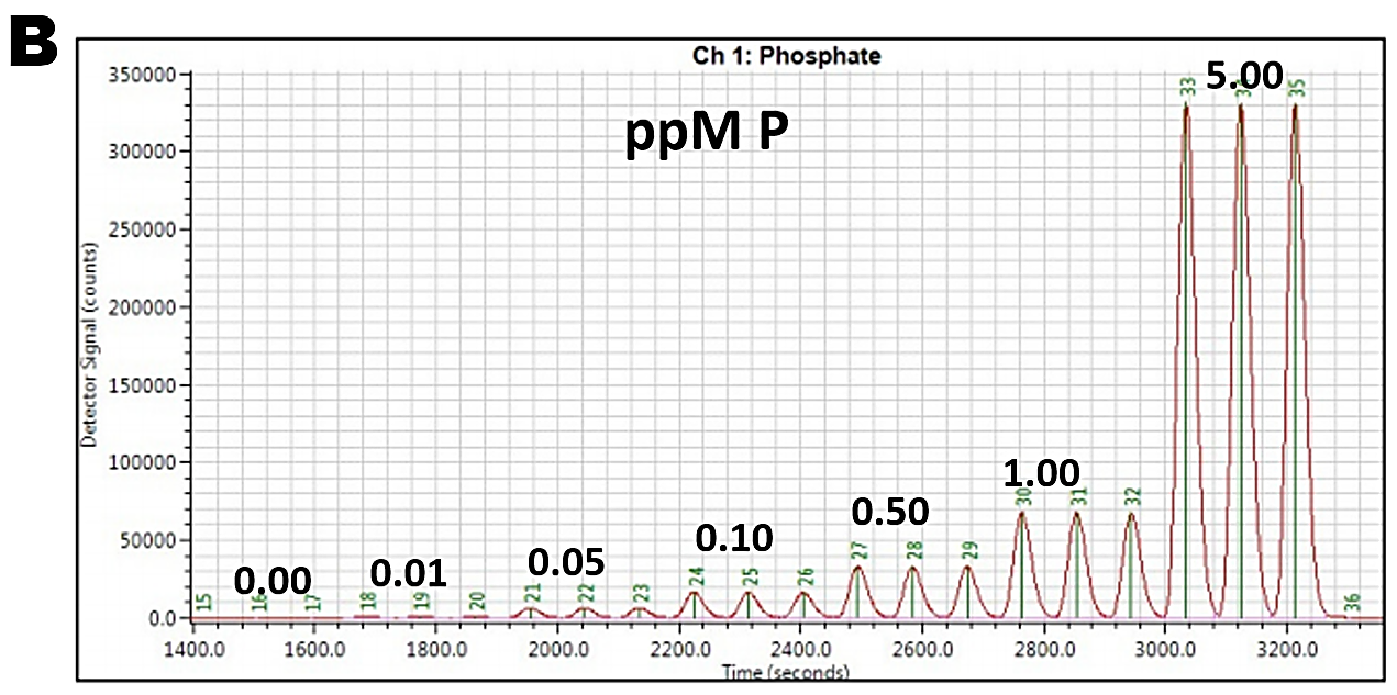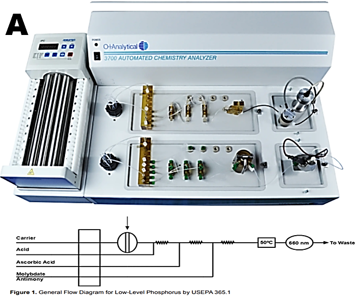Commercially available instruments vary considerably in design and applicability. The design falls into two categories: “black box” and “open architecture”. The purpose of black box design is to minimize users input on the instrument configuration, including the software programming. While the design makes these instruments ideally suited for routine serial assays, the trouble shooting and maintenance has to be carried out by professional service making the user captive of a given brand. Lachat Quickchem 8500 instrument designed some 40yrs a a vast portfolio of anes, determined in a variety of materials similar two channel architecture albeit in updated technology has OI Analytical FS 3700 Analyzer (A) shown here in two channel version. Configured for phosphate assay it covers range of 0 to 5 ppm P at a sampling rate 45 s/hr with lowest quantifiable concentration of 10 ppb P. (B).