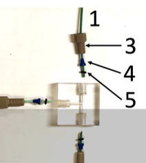 This construct was made leak free by using following fittings and O-rings:, 1 – optical fiber, 2- waste line, 3- flangeless nut, 4- flangeless ferrule, 5- O ring. (flangeless nut, P-230, IDEX Health & Science, LLC, Oak Harbor, WA, USA), ferrules (Flangeless Ferrule Tefzel™ (ETFE), P-200X, IDEX Health & Science, LLC, Oak Harbor, WA, USA) and O-rings (#003 Buna-N O-Ring).