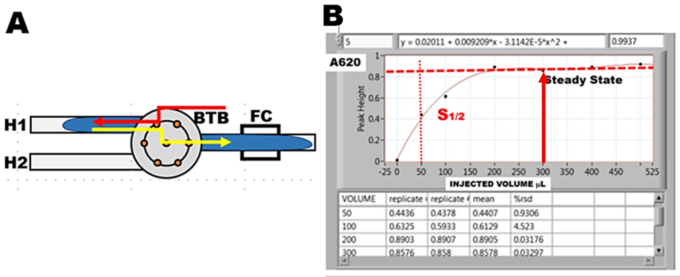 To eliminate concentration gradient, formed while sample zone travels to and through a flow cell, the volume of this flow path must be minimized, and the injected sample volume must be maximized until solution within entire length of the flow cell has a uniform composition. To find out when this condition is met, increasing volumes of a dye (bromothymol blue BTB, Amax 620nm) are injected into lab-on-valve manifold (A), furnished with a flow cell for absorbance measurement. By plotting the height of recorded peaks vs. injected volumes (B), an F-curve is obtained where at S ½ volume absorbance equals 50% of steady state value while at four S ½ volume absorbance reaches 96% of steady state. Therefore, when using this, lab-on valve manifold (C) where sample travels through 20 μL flow path into 100 μL 20cm long flow cell, the last step of flow protocol (D) must be designed to transport 300 μL of sample + reagents mixture into flow cell for absorbance monitoring.