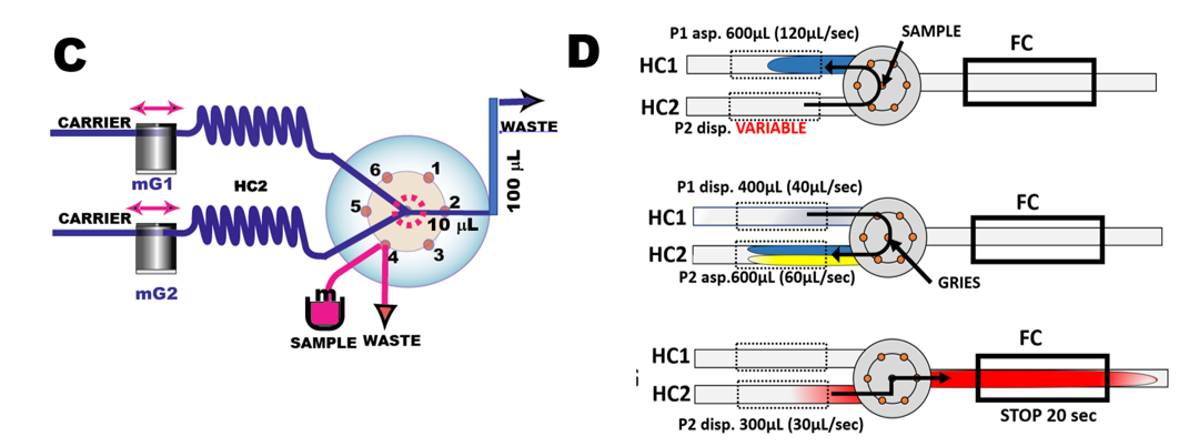 Note that volumes and flow rates of merging streams in the second step of batch-flow protocol (D) are selected in such a way that sample and reagent zones exactly overlap. Further homogenization takes place when reaction mixture travels from holding coil 2 into flow cell.