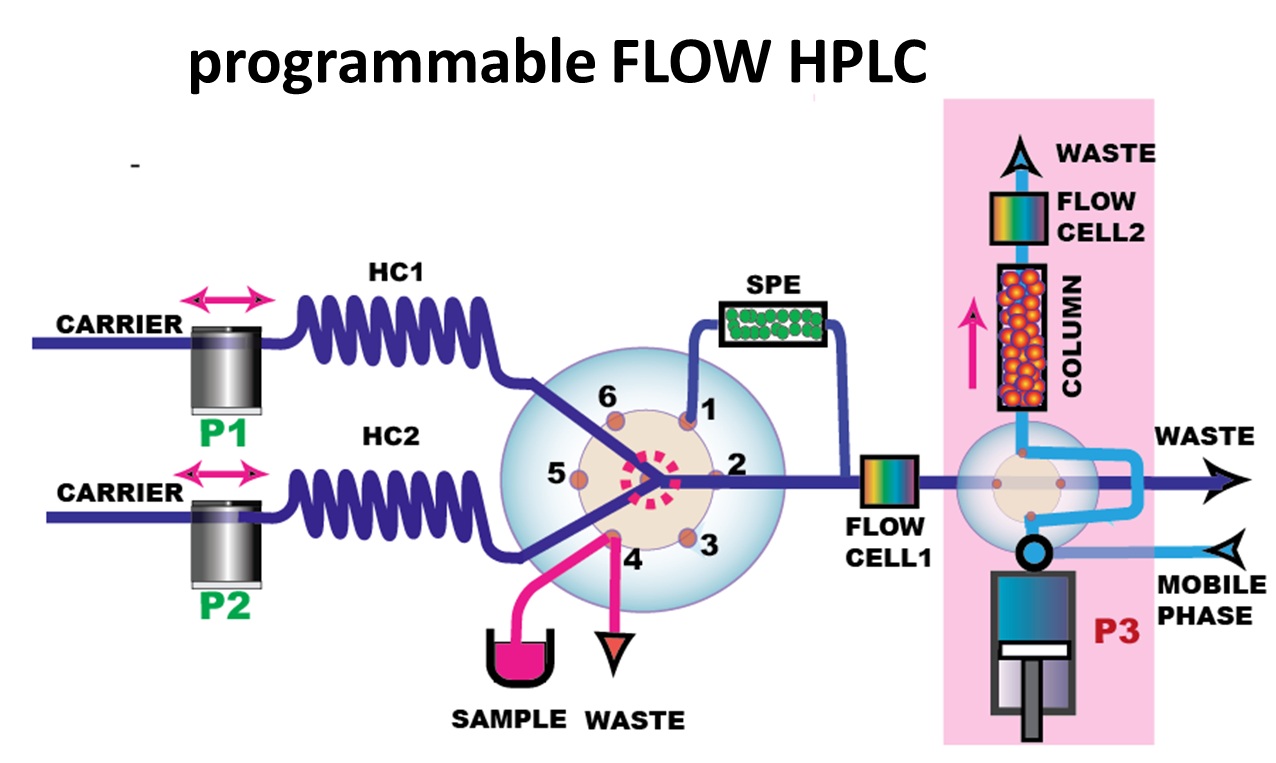 pF-HPLC is a hybrid system comprised of low pressure pFI and high pressure HPLC. It is based on injection of sample that travels upstream from injection point into a reactor where target analyte are is processed. Following flow reversal moves reaction mixture into loop of two position valve that serves as interface between low and high pressure systems. A high pressure pump (P3) moves sample trough a column, where sample components are separated due to difference in migration velocities, resulting in a multicomponent response curve that yields quantitative information on content of target analytes. SPE column is optional, while flow cell 1 is used to monitor positioning of sample within loop of the valve.