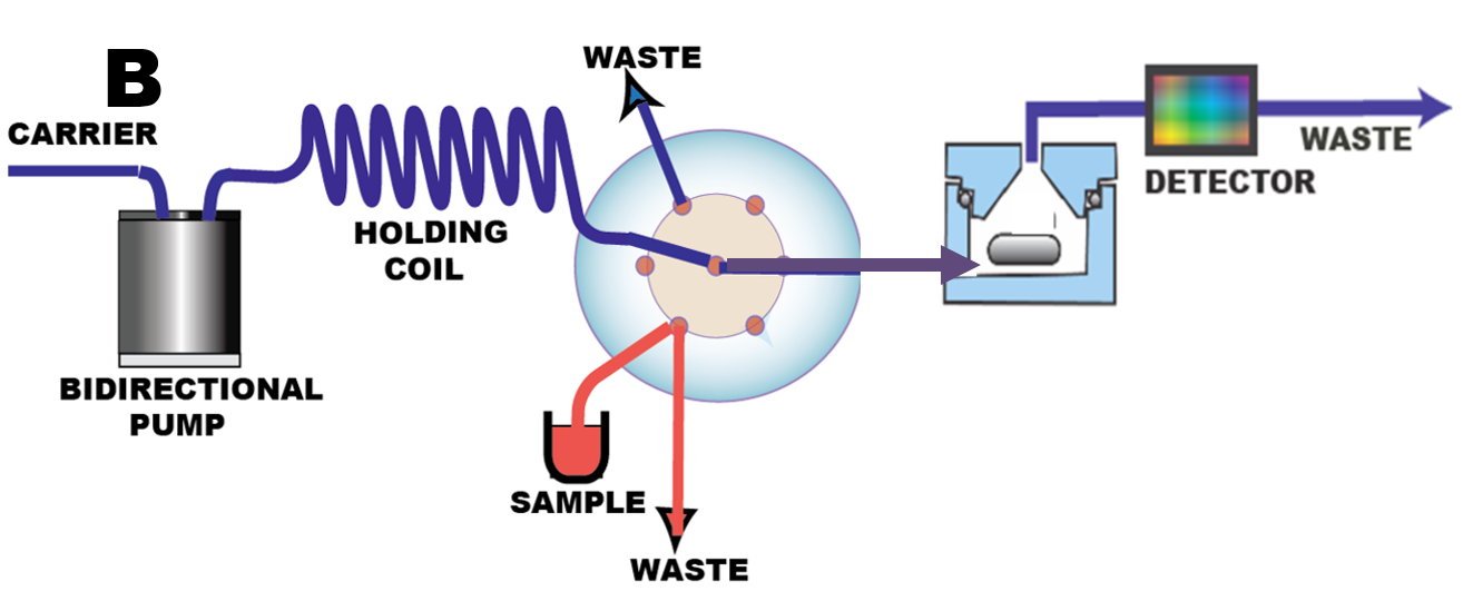 In batch-SI mode (B) versatility of Sequential injection is enhanced because the number of reagents used is no longer limited to two. Also, performance of mixing chamber is enhanced by flow programming. Stopped flow period will prolong incubation time while accelerated flow will rinse the chamber effectively. This is important because the stirred chamber, has typically volume of 1 to 2 mL, which cannot be further reduced, while being more difficult to rinse than systems made of tubular channels. Flow programming lends batch-SI a range of options from kinetic (nonequilibrium ) to static (equilibrium) conditions. While protocols for serial assays will be programmed in kinetic mode, since it yields higher sampling frequency, the static mode that replicates performance of manual batch method can serve as a research tool (Section 3.2.4.)