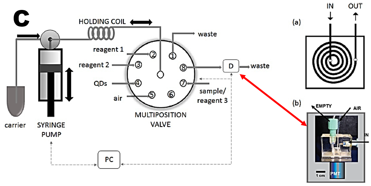 For chemiluminiscence based methods, mixing chamber serves as a flow cell to capture emitted light when reactants are being mixed. The batch type flow cell, coupled to SI manifold (C), was used to investigate enhancement of luminol/peroxide chemiluminescence by quantum dots (Sklenarova 2017).