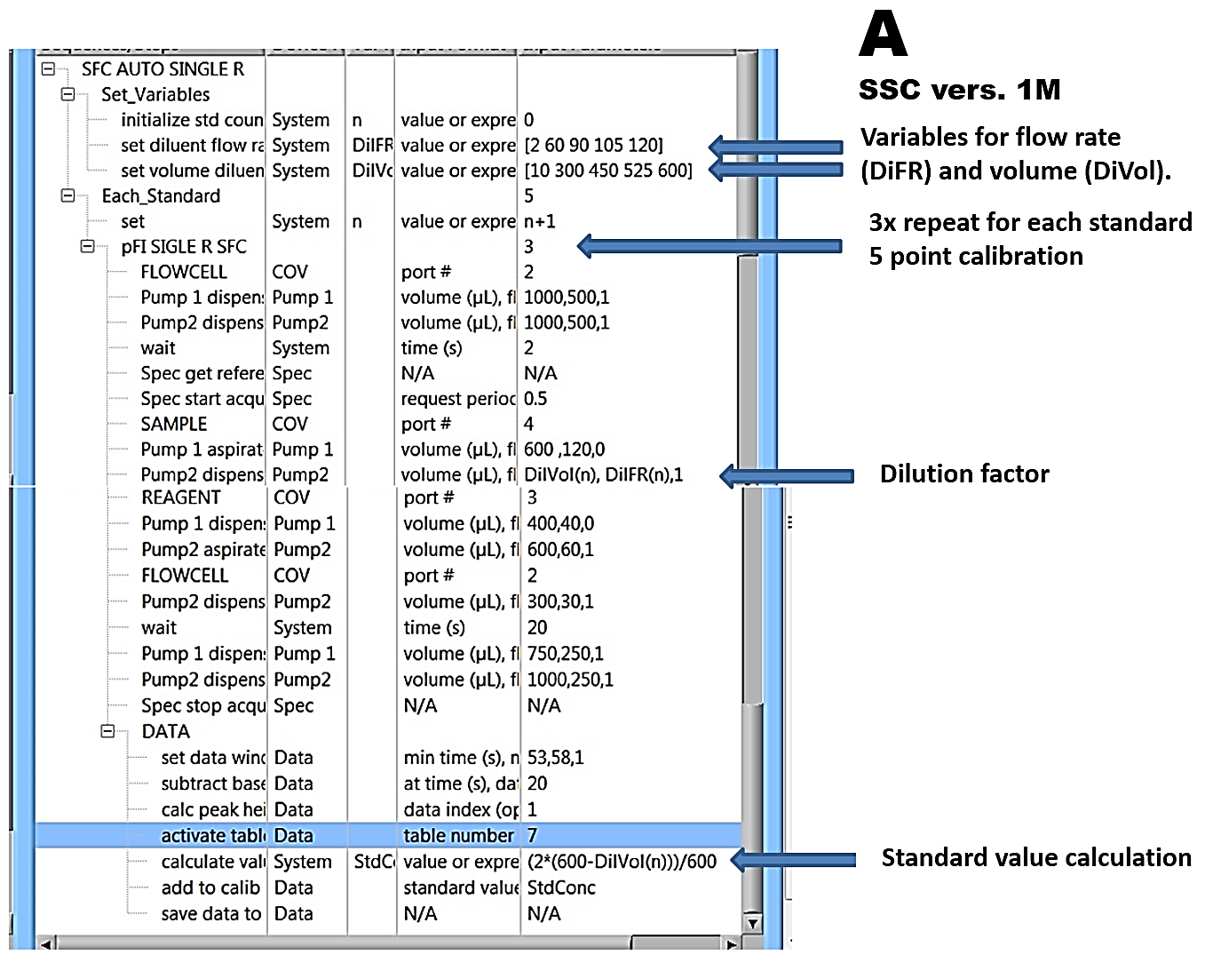 The automatic protocol is compiled either by daisy chaining five identical assay protocols into which increasing volumes and flowrates generated by P2, are inserted, along with corresponding standard concentrations, or by using script where dilutions and corresponding standard values are programmed (A).