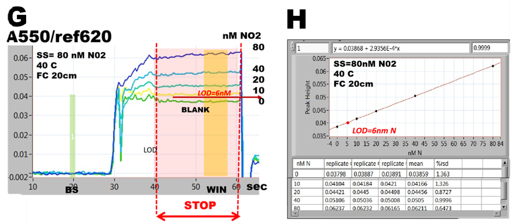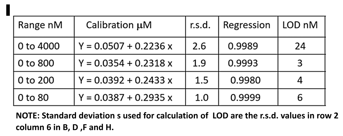 Absorbance values, collected form calibration runs (A,C,E,G), during stop flow period (WIN) tabulated in calibration graphs (B,D,F,H) yield slopes, intercepts and LOD values, that are almost identical (I). This is because the calibration response within 0-4000 nM range is linear (r2= 0.9989) and lower ranges are sub sections of this line. In ranges below 800 nM LOD values are identical because mean values of BLANKS as well as r.s.d values are low and similar (row 2, column 5 and 6, B,D,F,H).