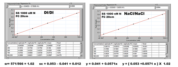 In this way, the DI/DI calibration is based on deionized water since the 1000 nM N SS was prepared in DI water and was diluted by DI, while SW calibration is based on SS prepared in SW and diluted by SW.