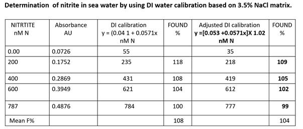 To illustrate the difference between DI and NaCl amended calibration SW samples were spiked with known amounts of nitrite (0 to 887 nM N), and the results are presented in the Table above.