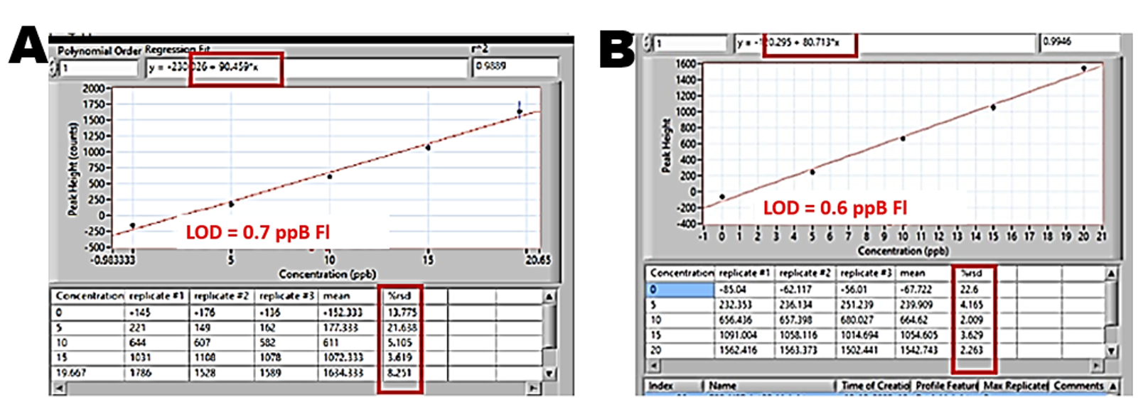 Because replacing PMT with more versatile CCD would be practical only if sensitivity of fluorescence monitoring with CCD and PMT was the same, preliminary experiments with fluorescent dye were done by using LOV platform (Section 3.2.7.1.) and software protocol (Section 3.2.5.2.) to carry out Single Standard solution calibration using 20 ppB fluorescein as sample. It was found that the thus obtained calibrations with PMT detector (A) and CCD detector are almost identical. This was achieved by maximizing intensity of illumination and integration time of CCD (Section 3.2.7.2. C, D), however it is likely that more sensitive CCD constructs will achieve the same result with shorter integration times.