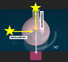 Scattering of radiation by suspended particles is used to measure their concentration by turbidity or by nefelometry. Turbidity like absorptiometry is less sensitive but yields a wider linear response. Both methods can use tungsten/halogen lamp for illumination although longer wavelength is said to be advantageous. Turbidity was used in cFI format for determination of sulfate precipitated by barium chloride reagent and for determination of chloride by silver chloride (Hansen Database). Turbidimetry and nefelometry are widely used for screening of water quality and of beverages. On an industrial scale turbidity is used to monitor water intake into desalinization plant.