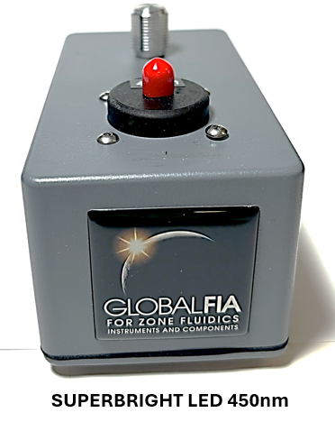 - PMT detector furnished with tunable blue LED and with 525/50 nm filter for fluorescence monitoring Global FIA year 2023.
