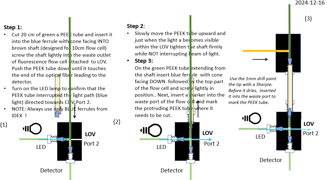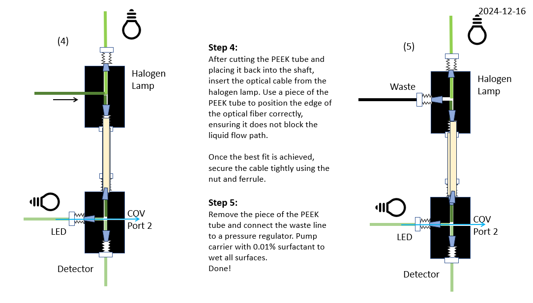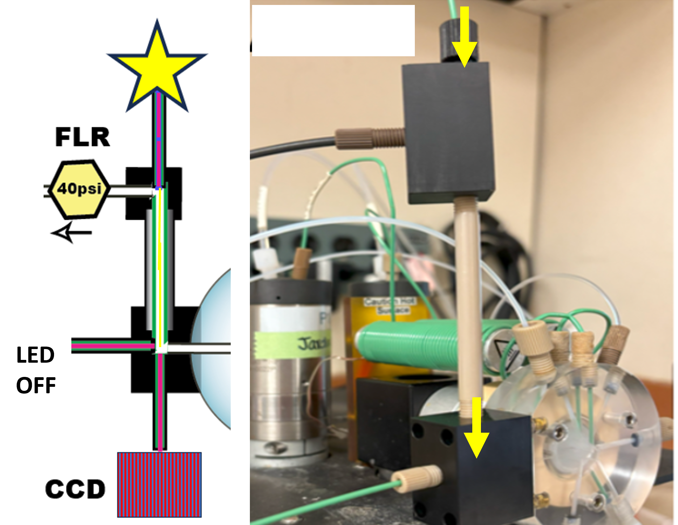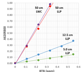 Sandwiched between black blocks that secure the illuminating and CCD optical fibers, the green PEEK tubing serves as the Long Light Path flow cell for absorbance monitoring. The entrance into thus formed Z flow path is connected to lab-on-valve while its exit atop connects to 40psi Flow Restrictor that prevents outgassing of the carrier stream. Since absorbance values are increasing linearly with the length of illuminated flow path 5 cm to 50 cm flow cells we used to enhance sensitivity of determinations. The LLP cell used here is 10 cm long and has internal volume of 50 microliters. As in the case of fluorescence, LLP cell performance is evaluated by autocalibration protocol that generates calibration line graph by graph by autodilution of solution of bromothymol blue (BTB). This yields information on reproducibility, sensitivity and linearity of instrument response. The protocol is designed to simulate single reagent assay where carrier and Reagent are DI water.