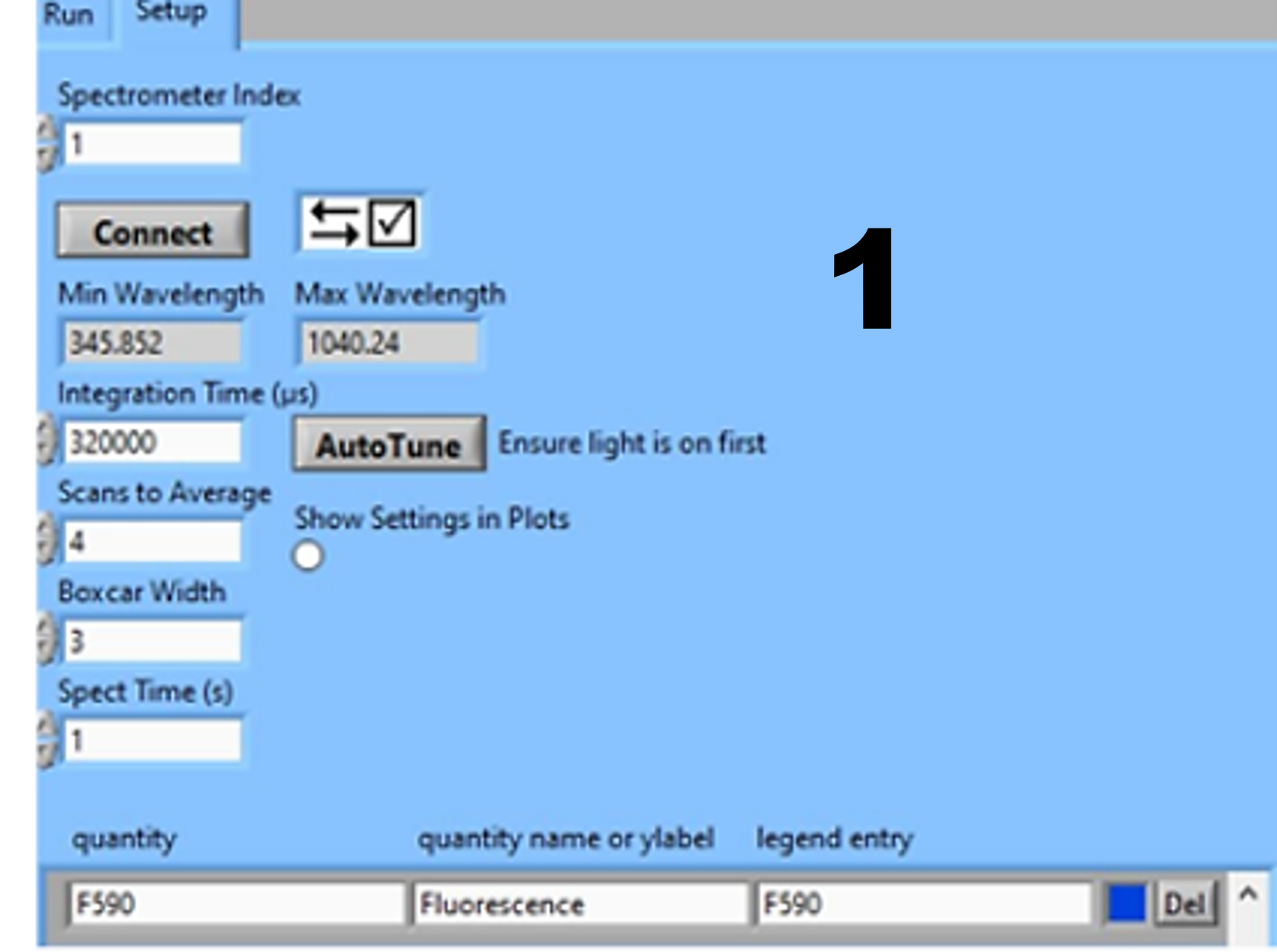 - Set up all values as shown on Setup panel. On Run panel set A620-A750 Absorbance.