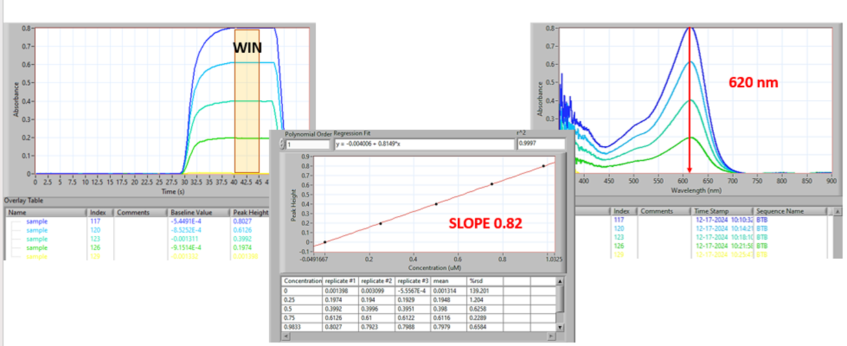 The software protocol shown in previous figure, designed for autocalibration by autodilution of single standard solution of bromothymol blue (100 ppb of BTB in 0.01M Na borate buffer pH 9.5), was used to generate results shown below. Panel on the left show absorbance values recorded while progressively diluted zones of dye are arrested in the flow cell. The data collected during WIN period were used to generate absorbance spectra and the calibration graph. The strictly linear calibration spans the range up to A=0.80 with baseline A=0.00, while the light path was 10cm long (volume 50 microliters). LLP cells with light paths between 5 and 40cm perform in similar way.