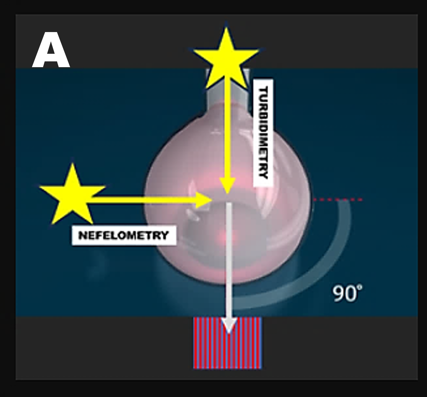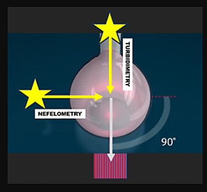Nephelometry of suspended particles measures increase of radiation reflected at 90 degrees to incident light beam (A). The method is said to be more sensitive than turbidimetry because the reflected light is monitored against a dark background. Therefore, nephelometry is widely used standard method in US (EPA 180.1) and EU (ISO 7027). Turbidimetry was not standardized in the US while ISO recommends its use for high turbidity samples.