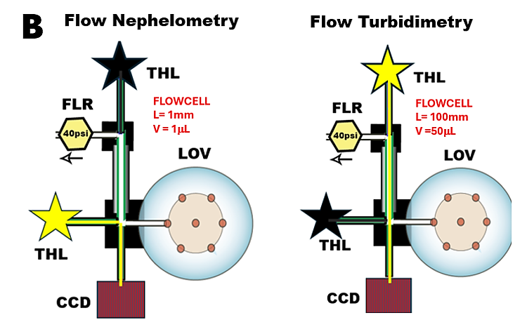The purpose of this section is to describe, for the first time, the automation of nephelometry and turbidimetry by programmable Flow Injection, performed with the hybrid flow cell designed to monitor turbidity in either nephelometry or turbidimetry mode, while thus obtained spectra are recorded by a CCD spectrophotometer.