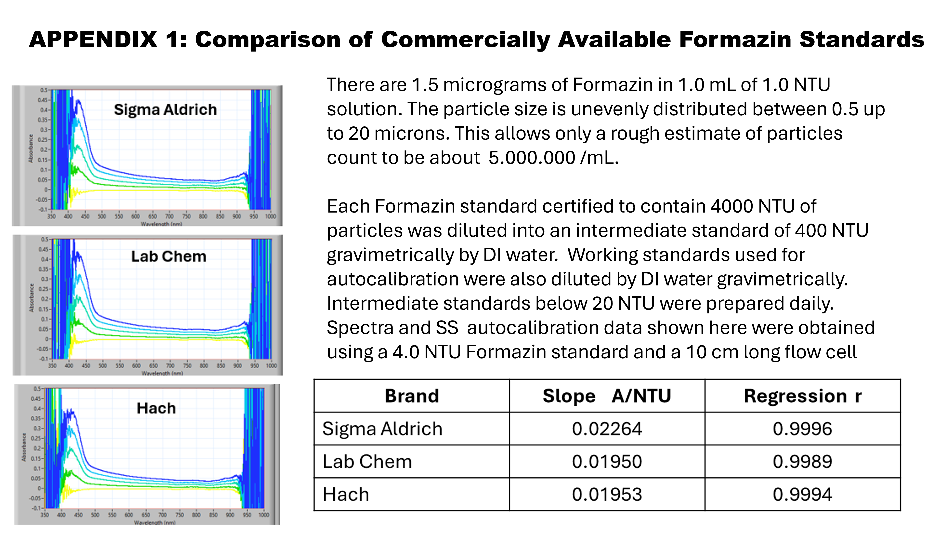 Standard materials. In contrast to spectrophotometry, where Absorbance is well defined by molar absorptivity at a given wavelength, the unit of nephelometry is empirical, based on the suspension of particles of Formazin, which is synthesized by reaction of hydrazine sulphate with hexamethylenetetramine. This stabilized suspension of irregularly shaped particles sized to about 1.5 μm with a distribution ranging from 1 to 20 μm is available from several vendors. In this work, we used the 4000 NTU certified standard by Sigma Aldrich (Supelco). Comparison of calibration data of certified Formazin standards from other vendors are in Appendix 1.