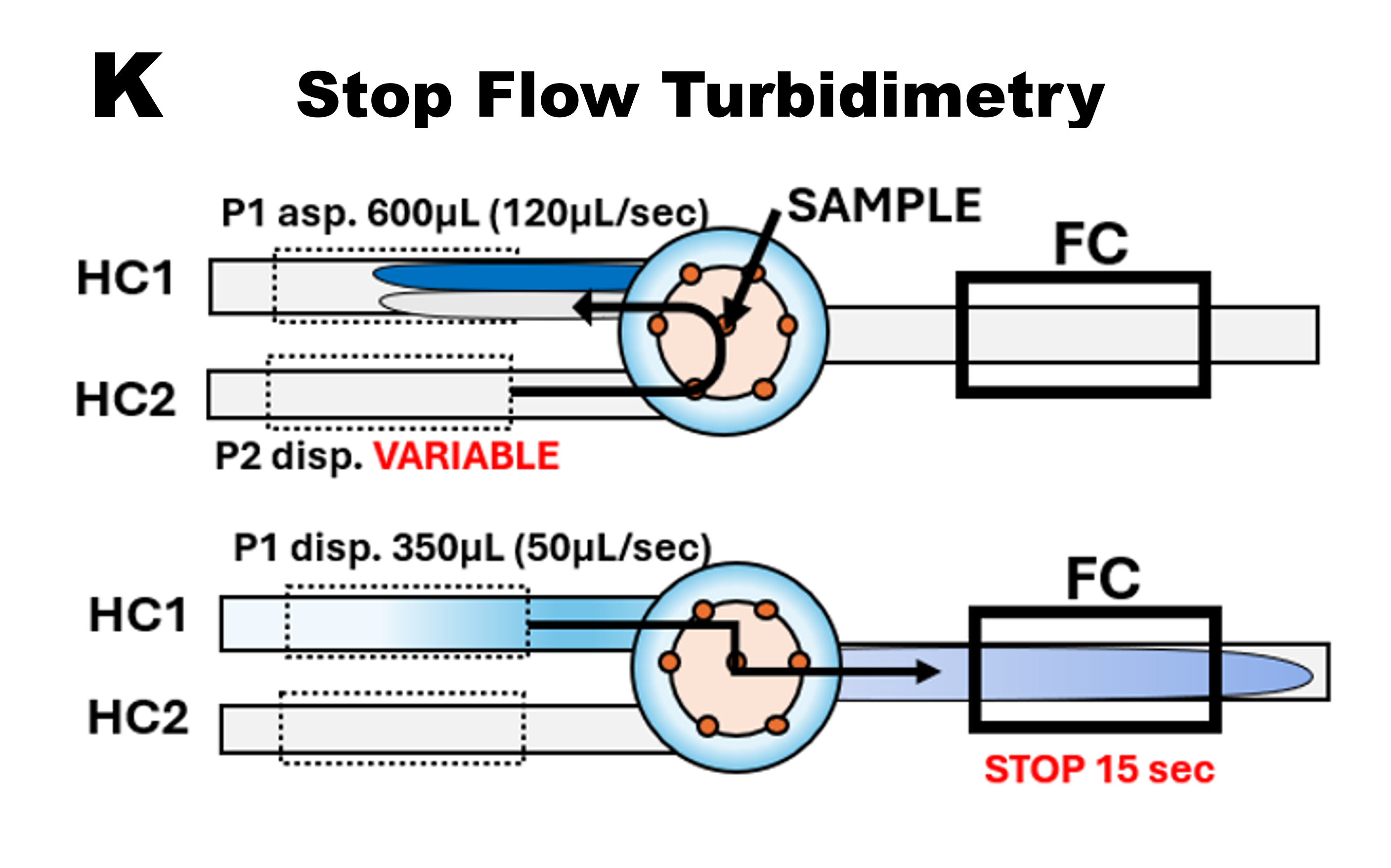 Similar to nephelometry, the flow protocol (K) comprises two parts: 1) autocalibration with a 20 NTU standard solution, 2) transport of suspension into the flow cell. However, while the autocalibration step is identical for both methods, monitoring of turbidimetry is done during the STOP flow period, on a selected section of bead suspension that has been arrested within the flow cell. Therefore, volume and flow rate of carrier solution (Pump 2) during the second step, is chosen to position the centroid of sample zone into the middle of flow cell, to maximize sensitivity of determination (Detailed explanation is in Sec. 3.2.3.). The flow protocol is executed by software program (L) that also performs data collection and processing.