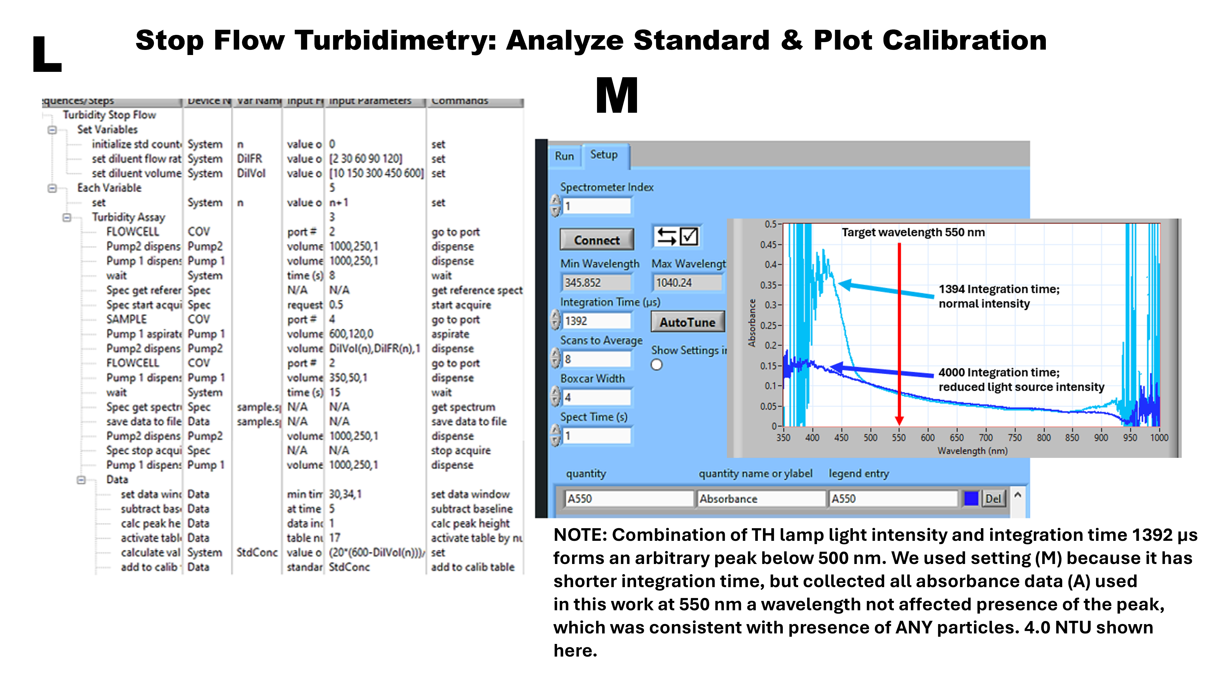 Over the entire spectrum range, the absorbance A is directly proportional to the concentration reaching maximum at 450nm (N), when signal becomes noisy due to the diminishing intensity of the THL source and low sensitivity of CCD sensors in this range. Interestingly, this corrupted peak is not specific for Formazin since it is also present on turbidity spectra of particles of Suspended Matter. We decided to monitor absorbance at 550 nm because the HT lamp light is most intense at this wavelength and because this wavelength complies with EPA norm, however wavelengths up to 850nm would be suitable.