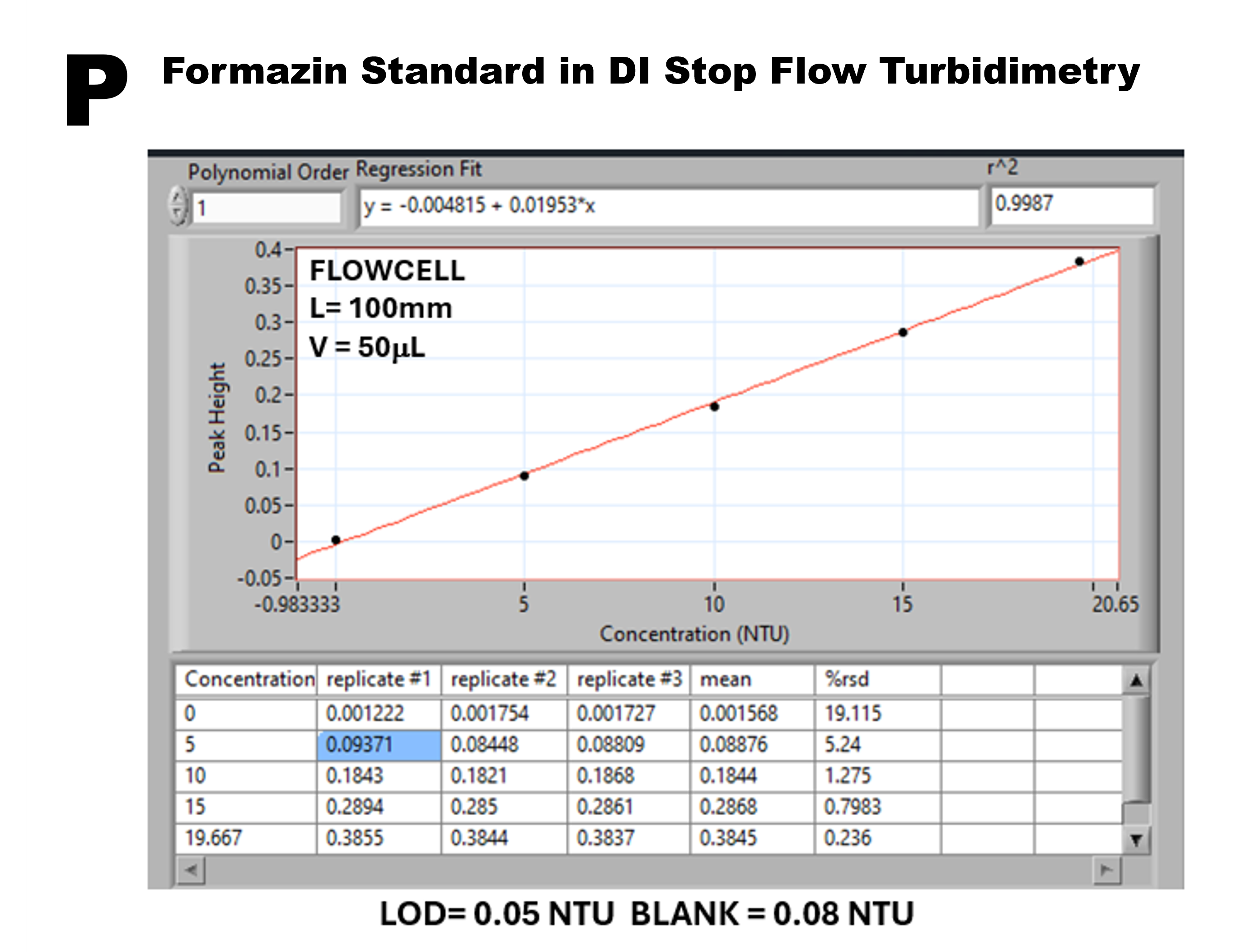 The calibration graph (P) in the range 0 to 20 NTU is strictly linear, of excellent reproducibility resulting in low limit of detection (LOD) and low blank values making stop flow turbidimetry well suited for the determination of suspended matter (SPM) in sea water. However, the influence of salinity of SW must now be investigated.