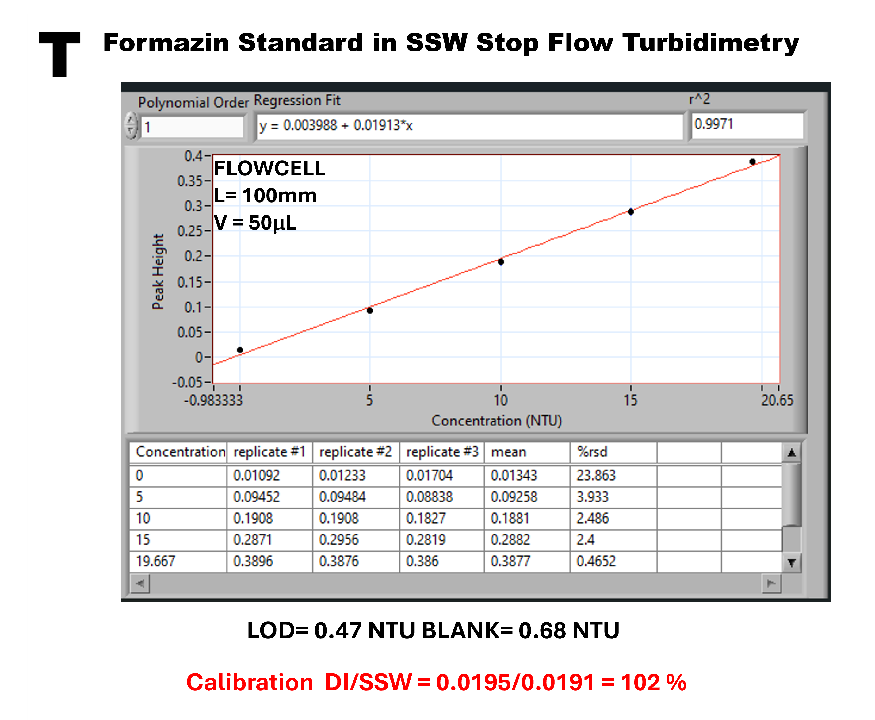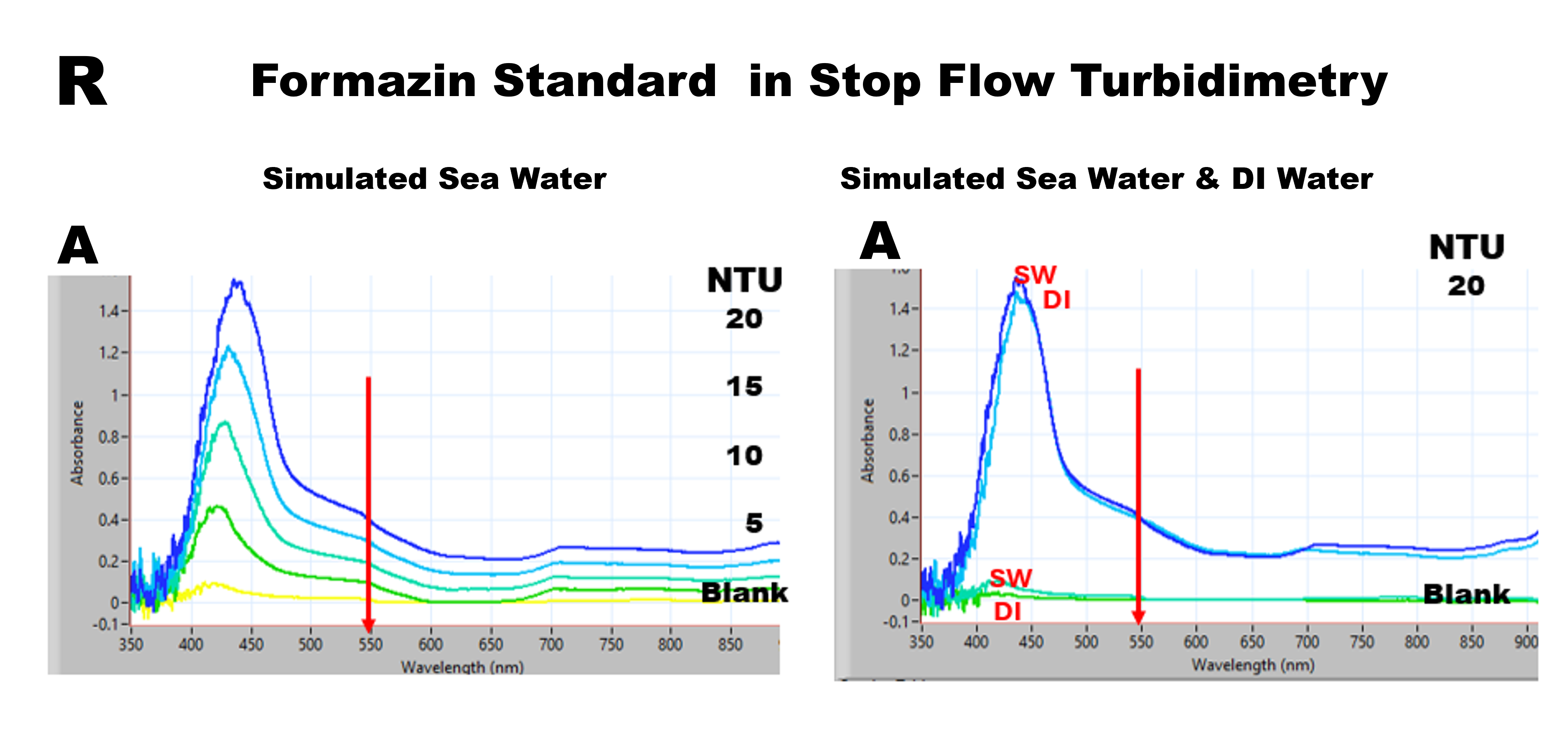 Sea Water calibrations for turbidimetry were obtained in the same way as was done for nephelometry by using Simulated Sea Water made of 3.5% NaCl in DI, which approximates salinity in open ocean water (35 PSU). Therefore, the 3.5% NaCl was used to prepare a 20 NTU standard and also was used as the carrier supplied by pump 2. In this way, the SSW based formazin standard was stepwise diluted with SSW. The data obtained by SSW calibration are presented in three formats: 1) spectra versus concentration (R), 2) time versus concentration (S), and 3) resulting calibration graph (T).