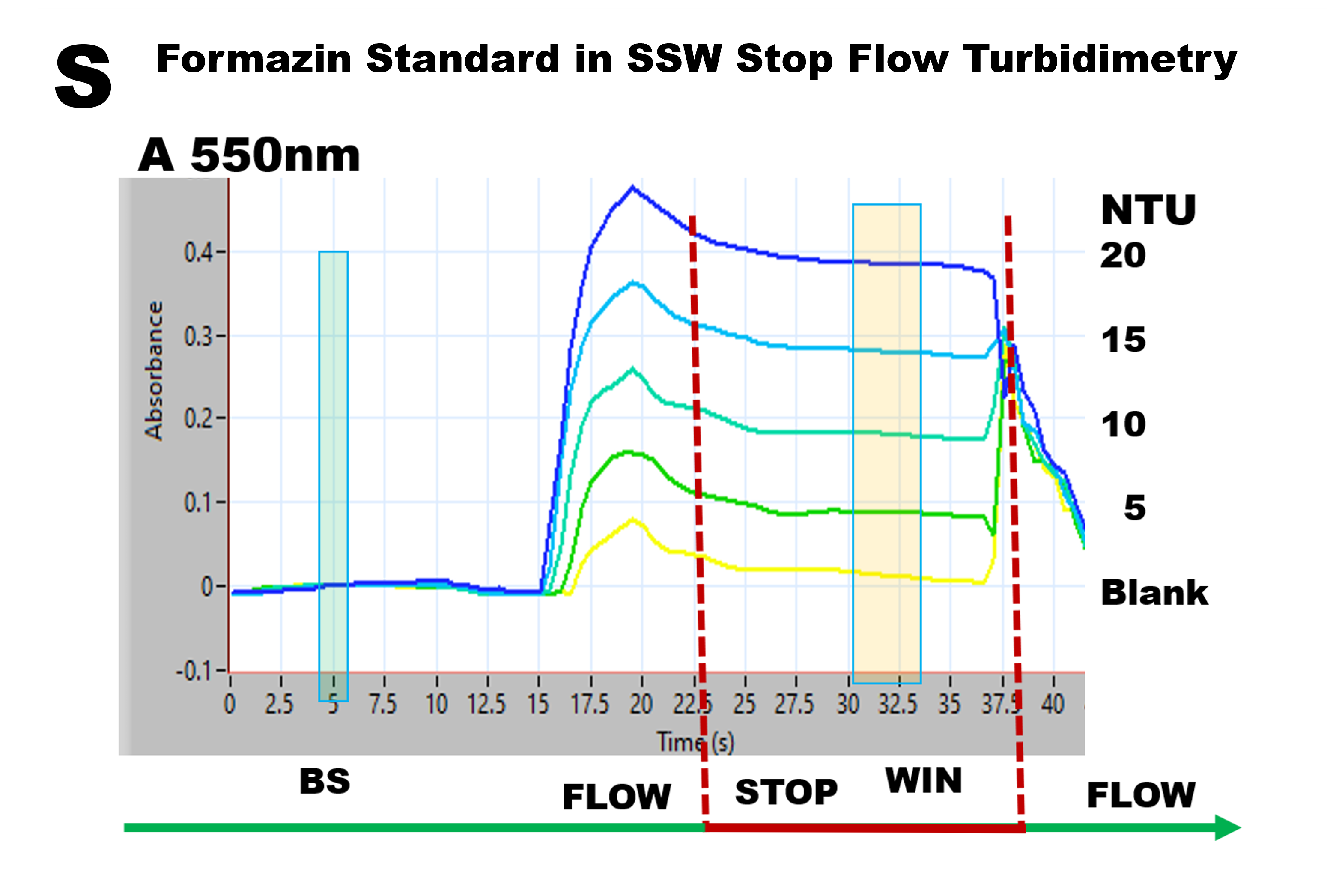 There is, however, a large difference between time/concentration plots, recorded with formazin standards prepared in DI (O) and SSW (S). These differences are caused by difference in Refractive Index between DI (carrier pump 1) and SW (carrier pump 2 and sample), that distort absorbance A in response to schlieren effect. However, by placing WIN at a 30 to 33 seconds position, well away from the refractive index position, its interference is eliminated. Therefore, DI and SW based calibration data (P and T) are identical, while the slopes of DI/SW calibration lines differ only by 2%.