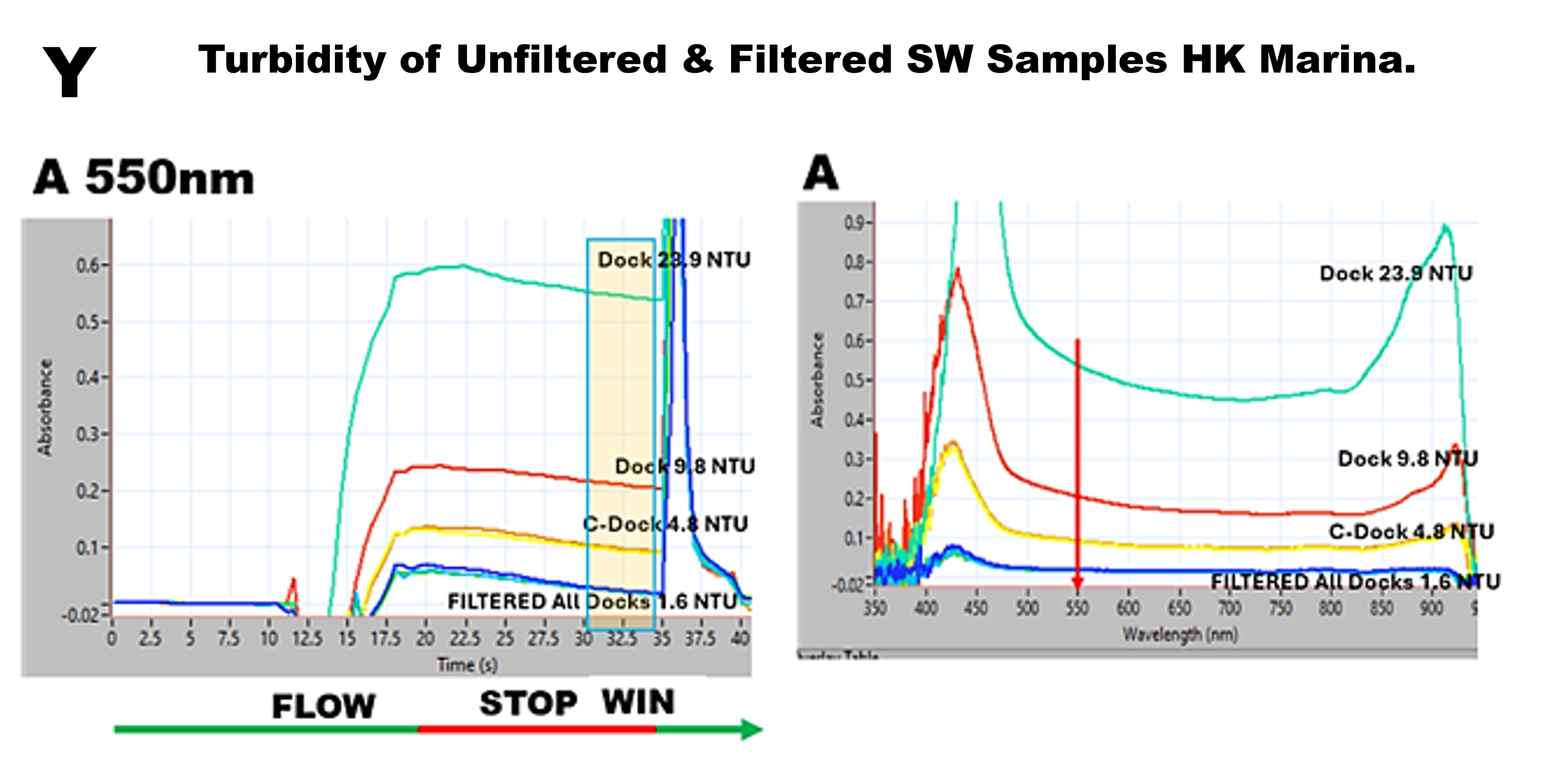 Prior to chemical analysis sea water is routinely filtered through 0.5 μm filter that allows soluble species and colloids to pass into a filtrate. To gain insight into effect of this sample treatment, we collected three SW samples (not the same as the samples analyzed above) selected to encompass a wide NTU range and analyzed them unfiltered and filtered (Y). Surprisingly while the unfiltered Dock samples contained 23.9, 9.8 and 4.9 NTU, the filtered Dock samples contained the same concentration of (colloidal ?) particles (1.6 NTU blue lines). In comparison, a 0.5 μL filtrate from 2 the 20 NTU standard contains 0.25 NTU. The spectra of Suspended Matter (Y right) support the calibration data and are very similar to and SM data while filtered SW shows only the 245 nm arbitrary peak on all blue lines.