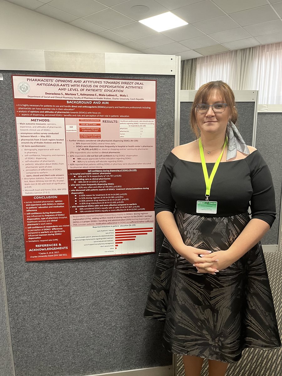 - 2023, May 4: Students Research International Conference: Congratulations to our students who succeeded with the work from clinical pharmacy between students from Czech and Slovak pharmaceutical faculties: ►1st place: Jana Procházková (Analysis of drug dosage adjustment in patients with chronic kidney disease; supervisor: J. Vlček); 2nd place: Jiřina Minaříková (Follow-up of patients after COVID-19 monoclonal antibodies administration; supervisor: E. Zimčíková)