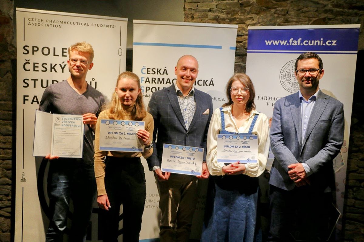 Many congratulations to our diploma student Monika Berková (4th year of Pharmacy study, 2nd person from left in the pictures) on her success at the Students' Scientific Conference (April, 4th–5th, 2024, Hradec Králové). She gave the 3rd best-evaluated presentation in Med. Chem. section with the title: „Synthesis of flutamide-like boronic acids and their potential in prostate cancer treatment.“