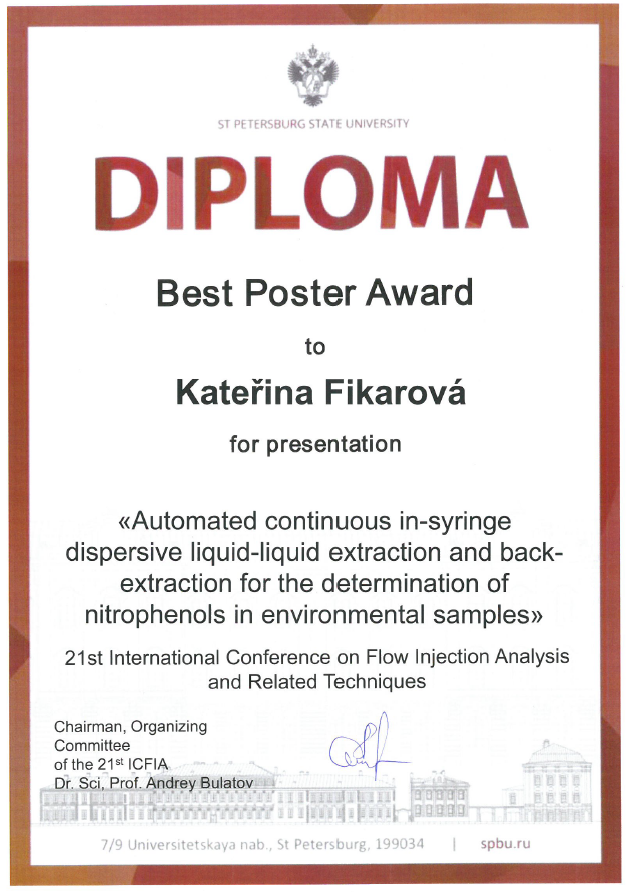 M.Parmová, L.Chocholoušová, D.Šatínský, J. Chvojka - Polyamide nanofibers as the sorbents for on-line SPE-HPLC determination of Bisphenol A in river water samples was awarded Best Poster Award, awarded by the Symposium and sponsored by Agilent Technologies)
